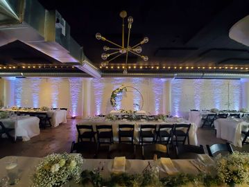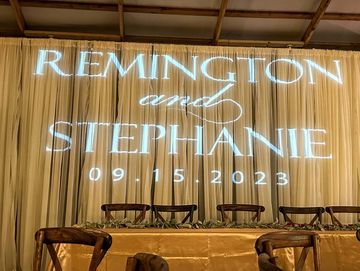 5 hours of fully customized music, from cocktail hour and dinner to high energy dance floor tracks, tailored to your vision. You'll get top-notch professional sound and intelligent dance floor lighting, plus a wireless microphone for speeches and announcements. 16 wireless up lights that will transform the look of your event space. And for the ultimate wow factor, we included your name in lights with our monogram projector.